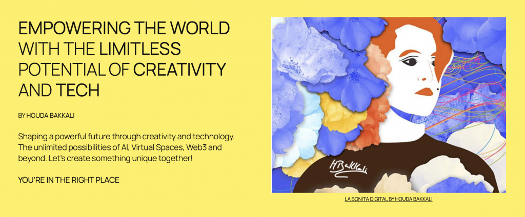 Since 2008, Houda Bakkali has pioneered projects at the intersection of art, technology, and communication, delivering open-access digital art experiences for large audiences in public spaces and educational institutions. She is the first artist to stage solo exhibitions in international airports in Spain that combine physical artwork, augmented reality, and immersive formats, with women’s empowerment as the conceptual core, at Madrid Airport and Málaga–Costa del Sol Airport. She was selected by the legendary American magazine TIME for the outlet’s first Web3 art project. She has also presented her artistic work and creative vision at the Alliance Française, widely regarded as the world’s largest cultural institution, with over 140 years of history, on a major international programme spanning 36 cities and 22 countries. Additional milestones include a groundbreaking simultaneous exhibition across six civic centres of Barcelona City Council, the first ever XR project tribute to Don Quixote, and XR multimedia cultural-heritage initiatives developed with public and private institutions across multiple territories.