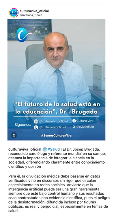 Sin embargo, es la Inteligencia Artificial la gran protagonista de esta nueva era, una tecnología disruptiva que está democratizando el conocimiento como nunca antes, esto afecta muy especialmente al conocimiento médico y cientifico. La capacidad de crear y difundir contenidos de manera ilimitada supone importantes avances, pero también importantes riesgos y retos. Sobre ello, el Dr. Brugada comenta que “esa capacidad de llegar puede ser buena o puede ser mala en función de lo que comuniquemos. La inteligencia artificial está bien si la seguimos controlando nosotros y seguimos contrastando que la información que produce es información verídica. Tener profesionales absolutamente dedicados que sepan comunicar y que tengan el rigor científico para comunicar lo que está científicamente probado y demostrado. Y, sobre todo, tener muy claro cómo vamos a controlar todas esas informaciones falsas y cómo comunicar que algunas informaciones no están demostradas científicamente, que pueden ser la opinión de alguien o que pueden ser la desinformación de determinados medios, etc.”