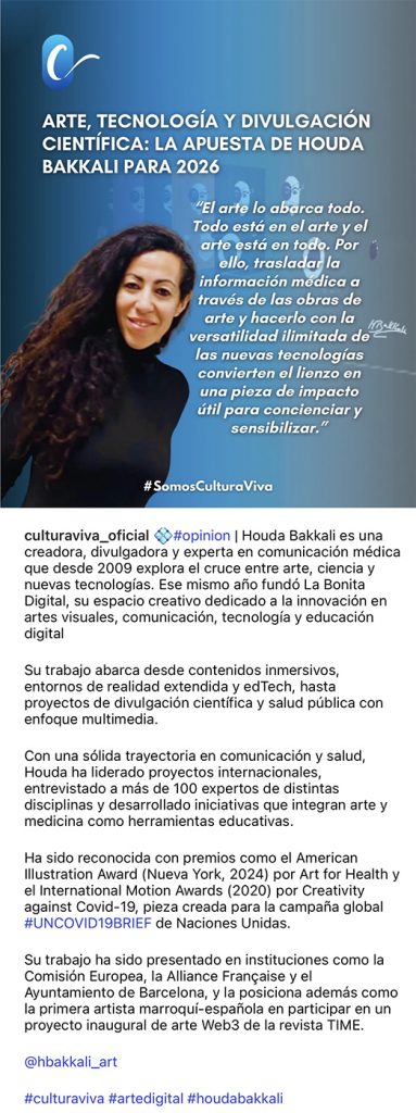 Como complemento, “Arte Digital, Cultura Digital” de Houda Bakkali, incluye una galería virtual, así como una selección de contenidos multimedia, recursos divulgativos y materiales didácticos que abordan el arte digital desde una perspectiva accesible y pedagógica. Estos contenidos profundizan en los usos, aplicaciones, utilidades y retos del arte digital, acercando al público a las claves de una disciplina en constante evolución y fomentando la reflexión sobre su impacto cultural y social.