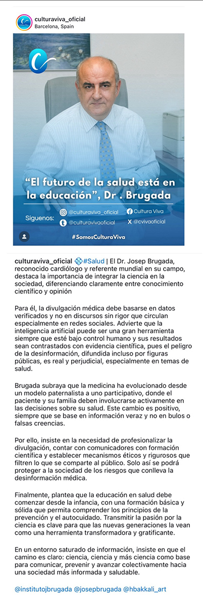 Esta obra ejemplifica el poder del binomio arte y nuevas tecnologías ayuda a trasladar a través de la creatividad de los artistas los mejores contenidos sobre salud firmados y avalados por los mejores especialistas y documentados por fuentes acreditadas. Contenidos medibles y actualizables en tiempo real, cuya dinámica hace que se adapten a cada información abarcando todos los detalles, abiertos a todos los espacios y a todos los públicos. Un enfoque didáctico y comunicativo, también una manera de sensibilizar que va más allá de la estética, aportando utilidad y compartiendo el conocimiento. Haciendo un uso responsable de la tecnología y fusionando el arte con la más humana de las ciencias: la Medicina. El arte humaniza la esta ciencia, tal y como indica el Dr. Josep Brugada “el arte ha ayudado muchísimo a humanizar la Medicina. Todo aquello que tiene que ver con la expresión artística de la Medicina es una forma de aumentar ese valor humano, ese valor que se encuentra fuera de la propia ciencia y ayuda a entrar más en el ámbito de las relaciones humanas, de las emociones que son absolutamente fundamentales en el ámbito de las relaciones entre las personas y especialmente en la relación entre médico y paciente.”