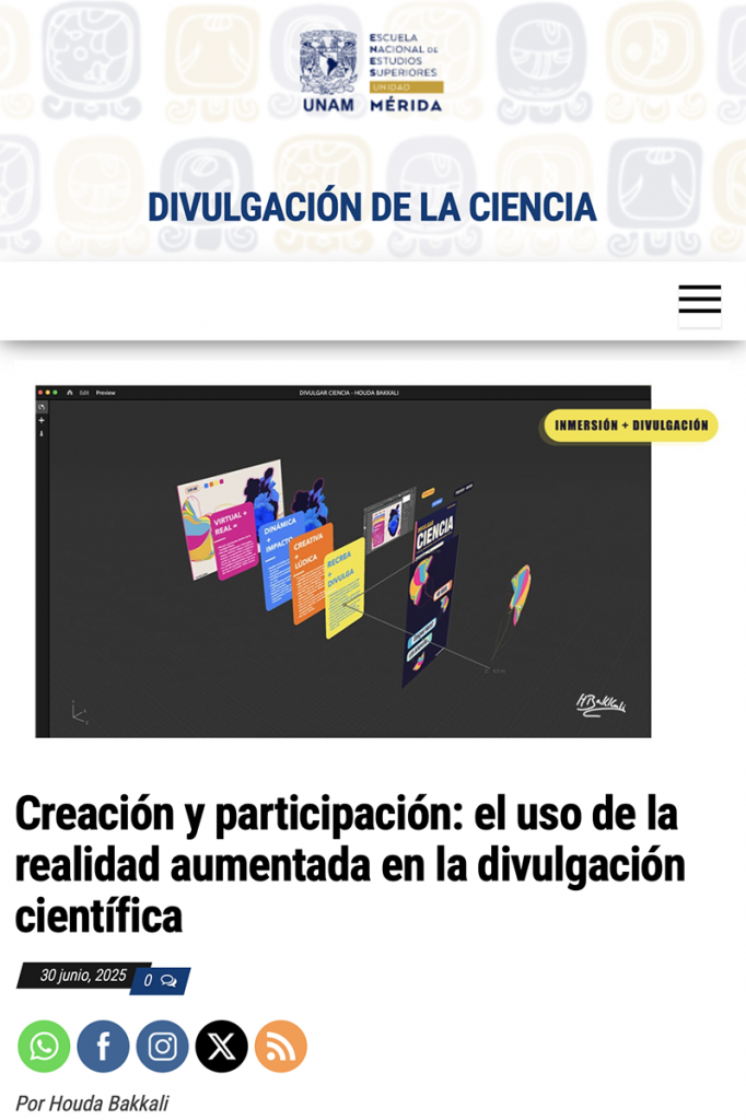 El blog de divulgación científica de la Escuela Nacional de Estudios Superiores de Mérida (ENES), institución perteneciente a la Universidad Nacional Autónoma de México (UNAM), recoge el artículo de Houda Bakkali sobre el binomio creatividad y nuevas tecnologías como herramienta clave para la divulgación científica.