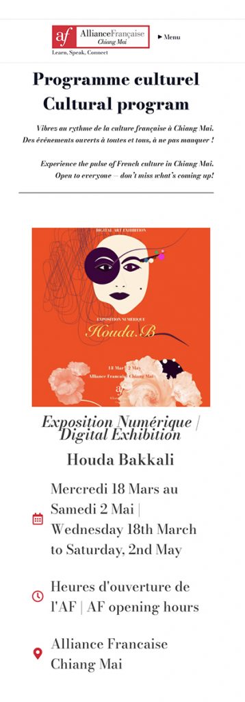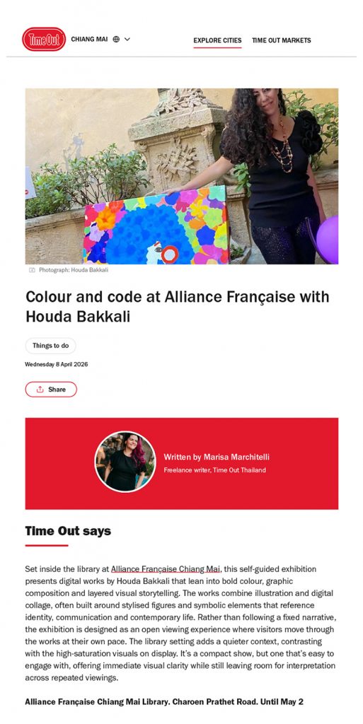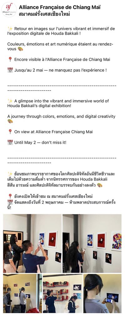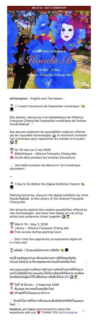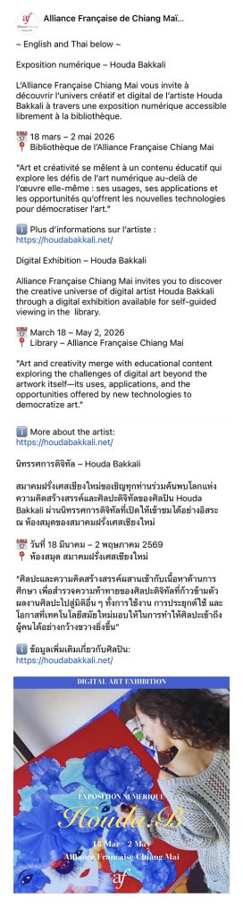 From March 18 to May 2, 2026, the Alliance Française of Chiang Mai, Thailand, hosts the exhibition “Digital Art, Digital Culture” by Houda Bakkali. The exhibition integrates physical and digital works in which the use of augmented reality, animation, and interactive elements predominates, proposing an exhibition format that allows the public to explore new forms of artistic interaction and interpretation.