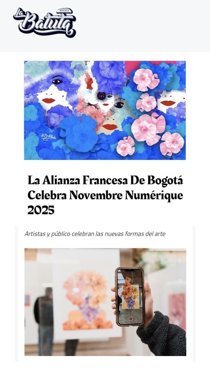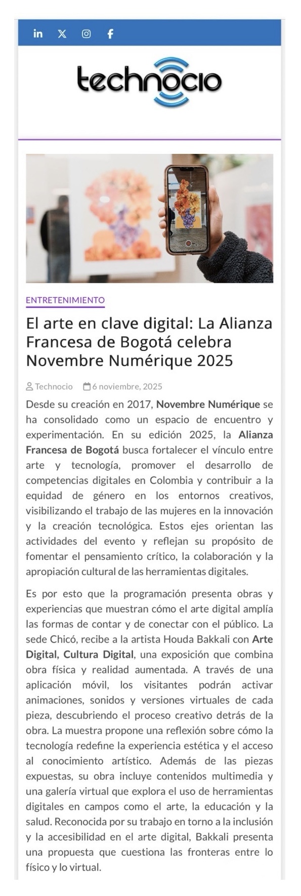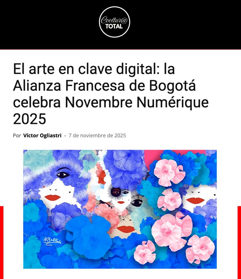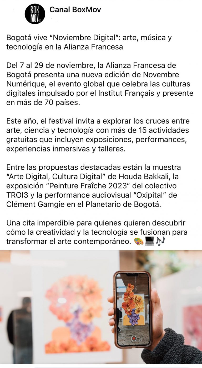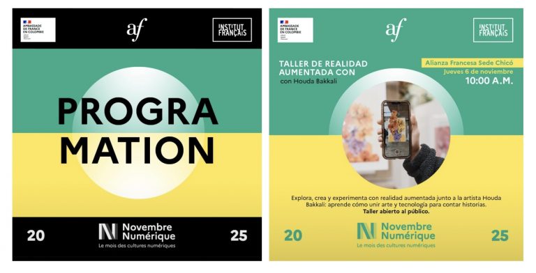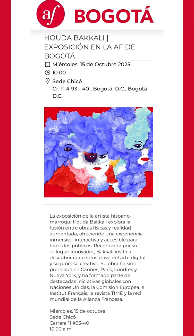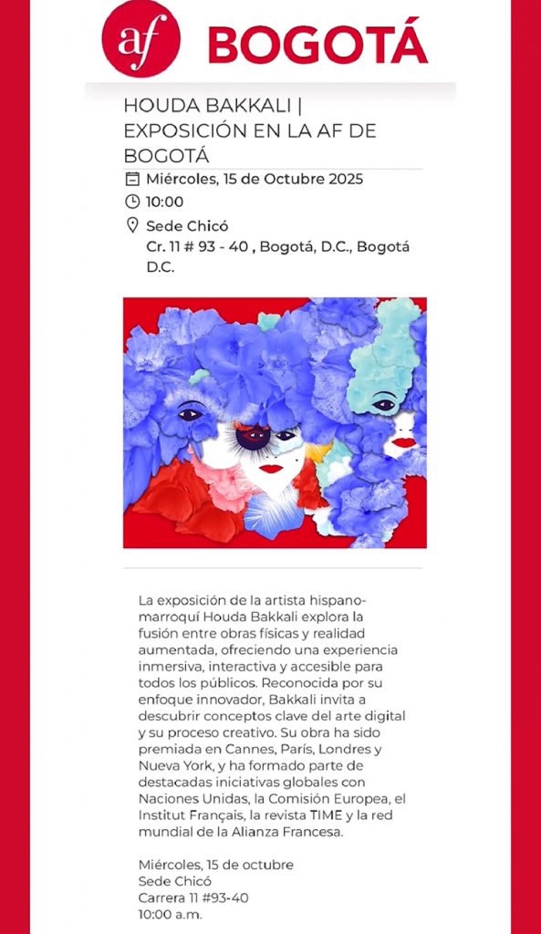Del 17 de octubre al 13 de diciembre, la Alianza Francesa de Bogotá, exponen en su sede de Chocó “Arte Digital, Cultura Digital” de Houda Bakkali. La muestra fusiona obras físicas y con la realidad aumentada, permitiendo al público disfrutar del arte de una manera diferente, más inmersiva, más lúdica y más interactiva. Asimismo, la muestra se complementa con una galería virtual, contenidos multimedia y recursos divulgativos y didácticos sobre arte digital, usos, utilidades y retos. La exposición se celebra en el marco del Noviembre Digital evento promovido por el Instituto Francés a nivel mundial para promover el arte y la cultura digital.