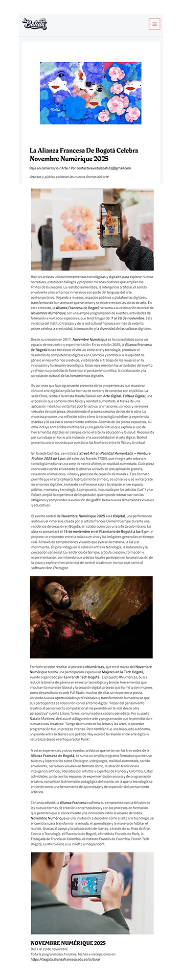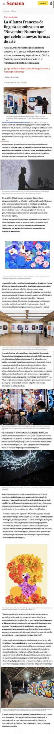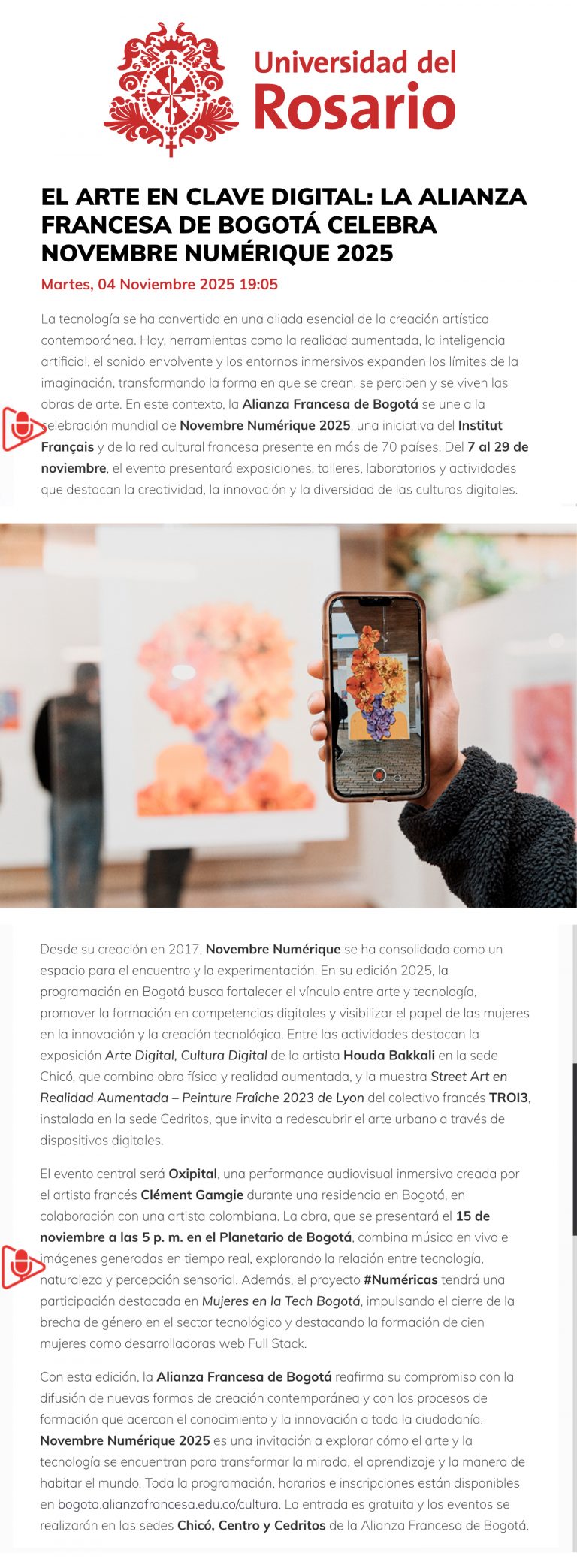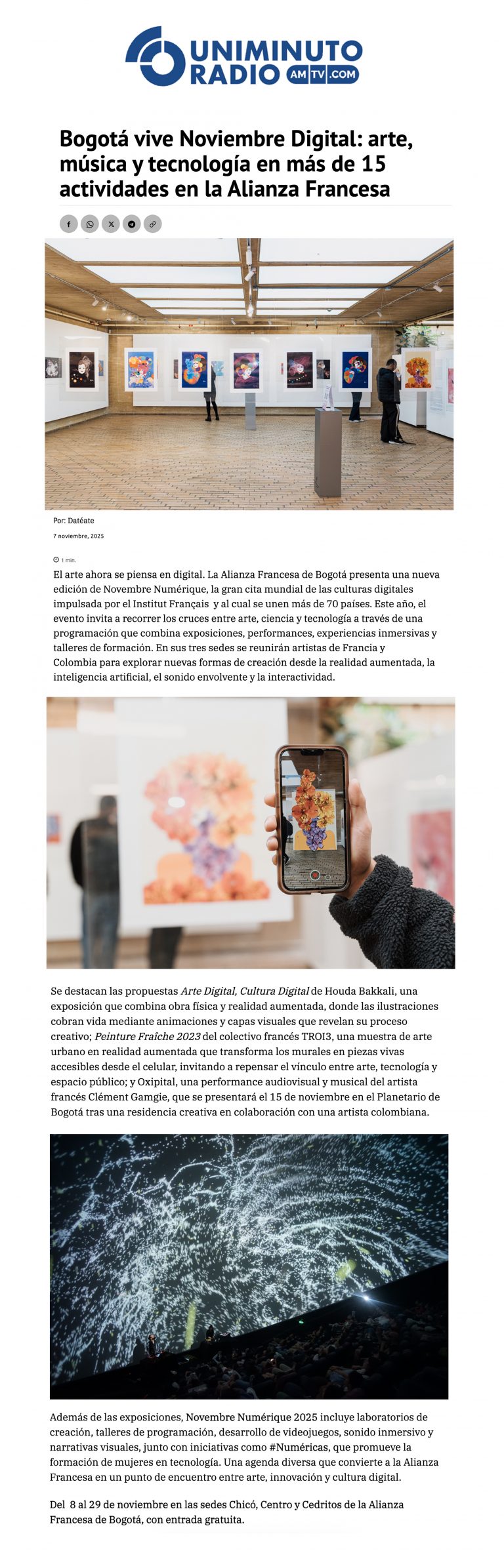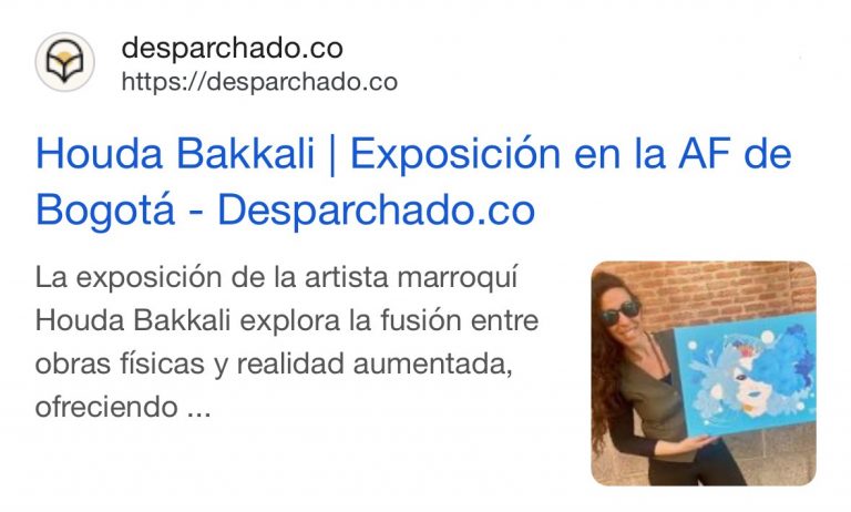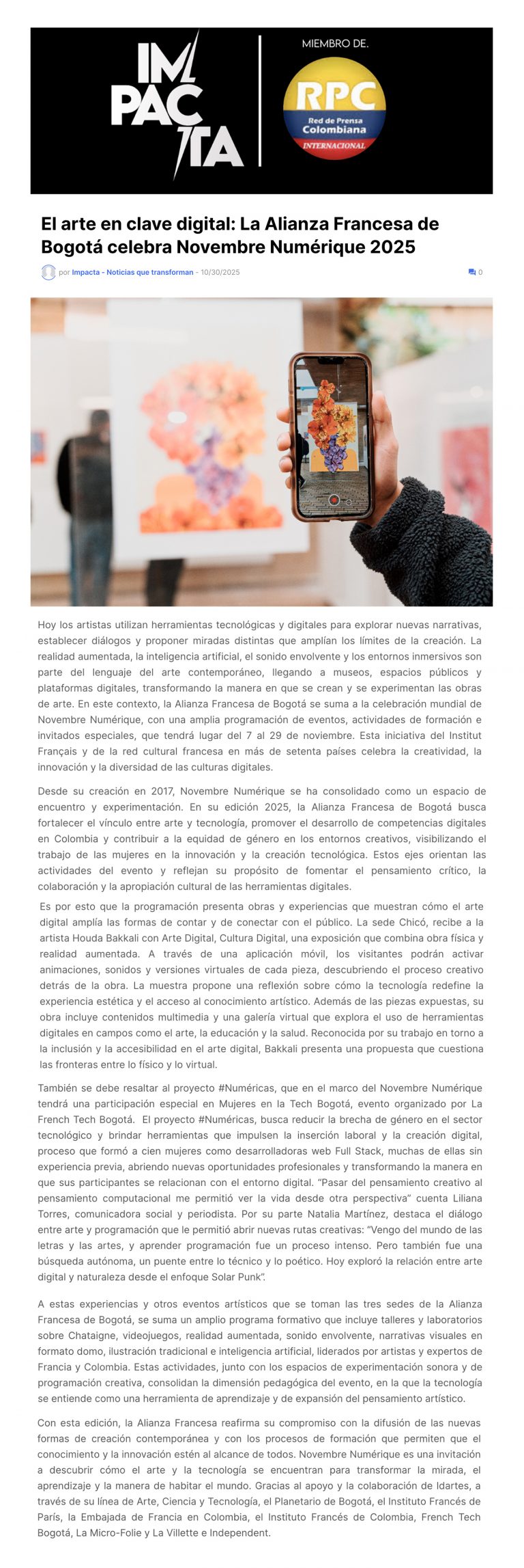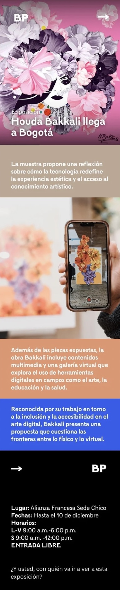 Del 17 de octubre al 13 de diciembre, la Alianza Francesa de Bogotá, exponen en su sede de Chocó “Arte Digital, Cultura Digital” de Houda Bakkali. La muestra fusiona obras físicas y con la realidad aumentada, permitiendo al público disfrutar del arte de una manera diferente, más inmersiva, más lúdica y más interactiva. Asimismo, la muestra se complementa con una galería virtual, contenidos multimedia y recursos divulgativos y didácticos sobre arte digital, usos, utilidades y retos. La exposición se celebra en el marco del Noviembre Digital evento promovido por el Instituto Francés a nivel mundial para promover el arte y la cultura digital.