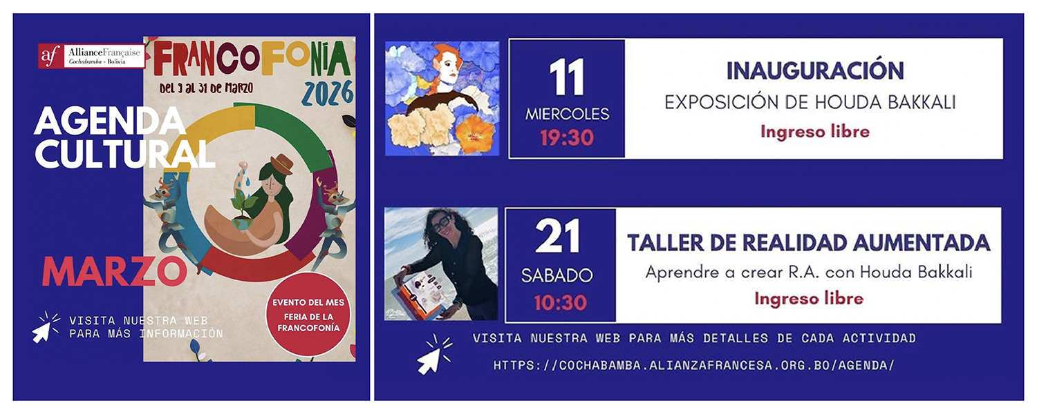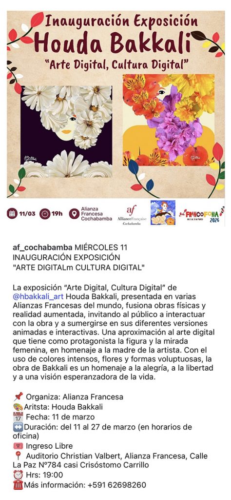 A partir del 11 de marzo, 2026, la Alianza Francesa de Cochabamba, Bolivia, acoge la exposición Arte Digital, Cultura Digital de Houda Bakkali. La muestra integra obras físicas y digitales donde predomina el uso de realidad aumentada, animación y elementos interactivos, proponiendo un formato expositivo que permite al público explorar nuevas formas de interacción e interpretación artística.