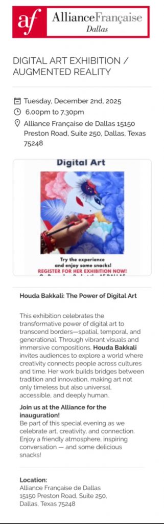 Starting December 4, the Alliance Française of Dallas, USA, presents “Digital Art, Digital Culture” by Houda Bakkali. This exhibition fuses physical artworks with augmented reality, offering visitors a new way to experience art more immersive, playful, and interactive. The show is complemented by a virtual gallery, multimedia content, and educational materials that explore the world of digital art, its uses, applications, and challenges.