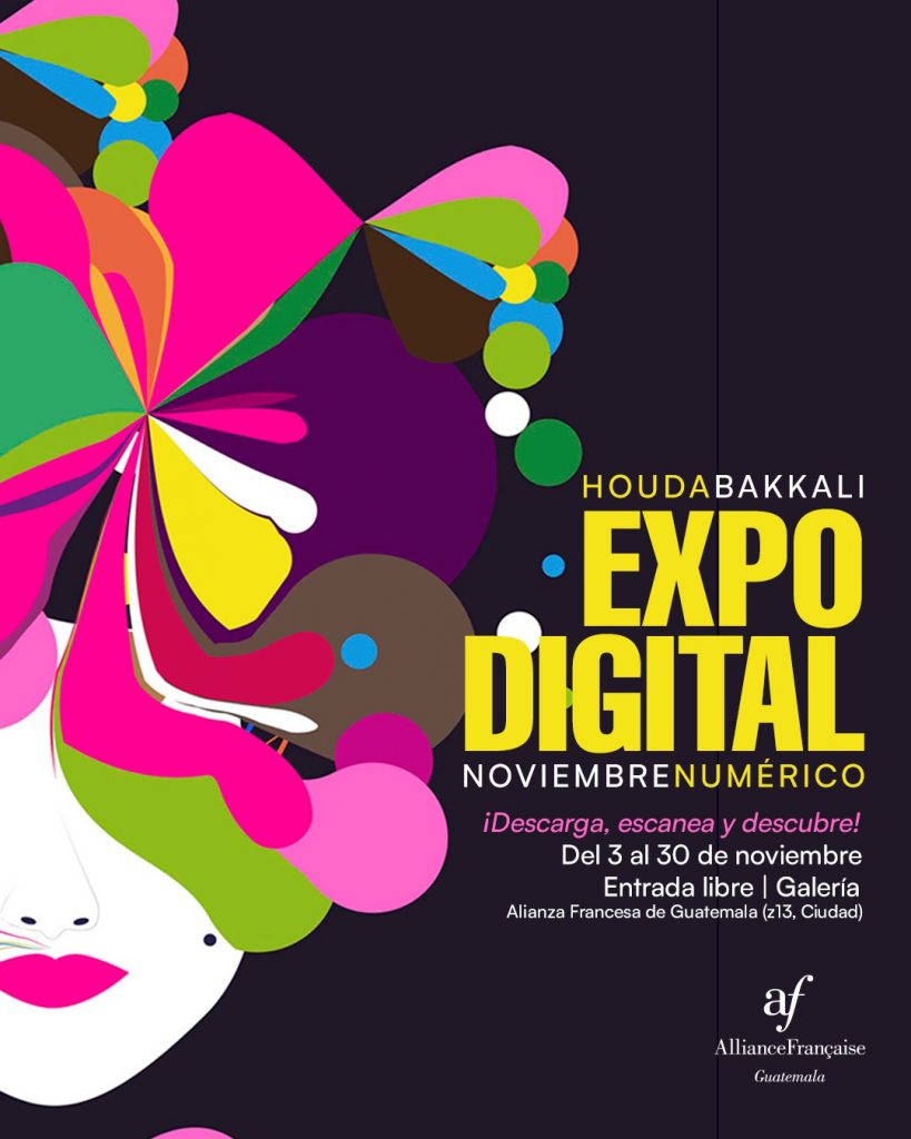 Del 3 al 30 de noviembre la Alianza Francesa de Guatemala, expone “Arte Digital, Cultura Digital” de Houda Bakkali. La muestra fusiona obras físicas y con la realidad aumentada, permitiendo al público disfrutar del arte de una manera diferente, más inmersiva, más lúdica y más interactiva. Asimismo, la muestra se complementa con una galería virtual, contenidos multimedia y recursos divulgativos y didácticos sobre arte digital, usos, utilidades y retos. La exposición se celebra en el marco del Noviembre Digital evento promovido por el Instituto Francés a nivel mundial para promover el arte y la cultura digital.