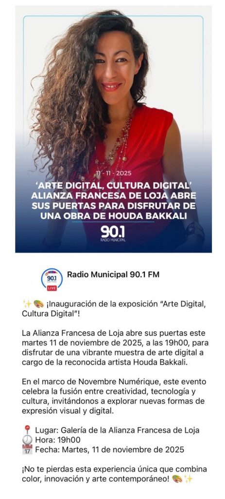 Del 8 de noviembre al 29 de noviembre la Alianza Francesa de Loja, expone “Arte Digital, Cultura Digital” de Houda Bakkali. La muestra fusiona obras físicas y con la realidad aumentada, permitiendo al público disfrutar del arte de una manera diferente, más inmersiva, más lúdica y más interactiva. Asimismo, la muestra se complementa con una galería virtual, contenidos multimedia y recursos divulgativos y didácticos sobre arte digital, usos, utilidades y retos. La exposición se celebra en el marco del Noviembre Digital evento promovido por el Instituto Francés a nivel mundial para promover el arte y la cultura digital.