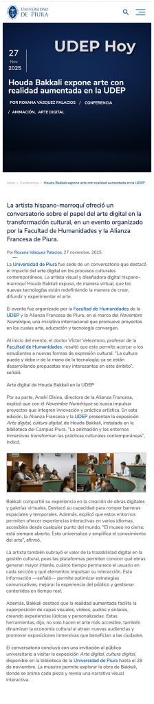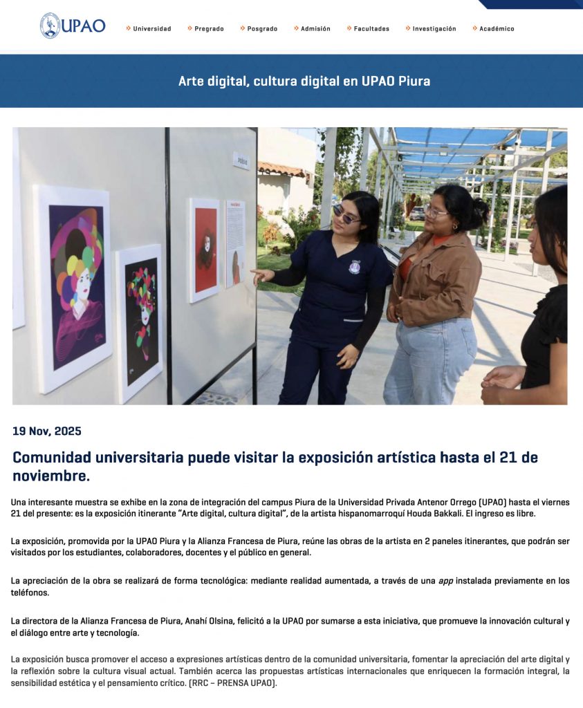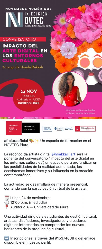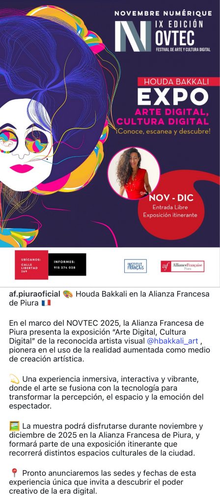 Desde 18 de noviembre la Alianza Francesa de Piura, expone “Arte Digital, Cultura Digital” de Houda Bakkali. Una muestra itinerante que recorrerá diferentes espacios expositivos como la Universidad Privada Antenor Orrego (UPAO), la Universidad de Piura, donde además Houda Bakkali impartirá una ponencia sobre arte digital, la propia sede de la Alianza Francesa y también la Mall Plaza Piura.