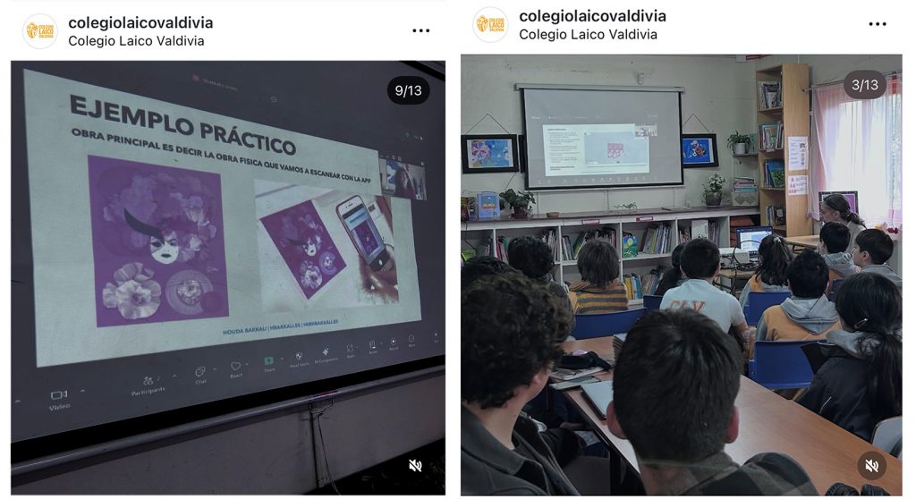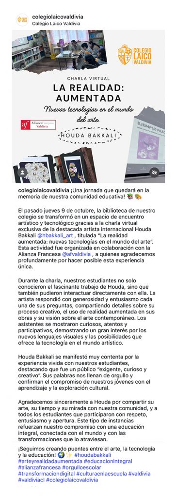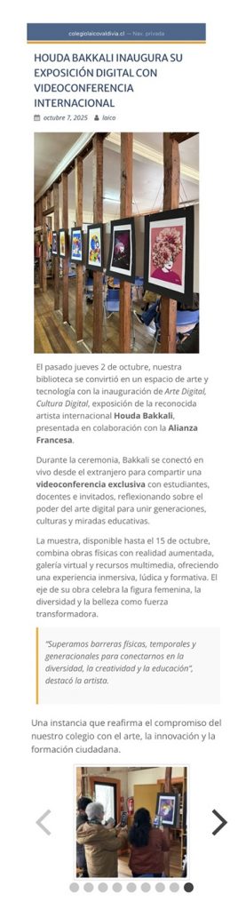 Del 2 al 15 de octubre, la Alianza Francesa de Valdivia y el Colegio Laico de Valdivia exponen “Arte Digital, Cultura Digital” de Houda Bakkali. La muestra fusiona obras físicas y con la realidad aumentada, permitiendo al público disfrutar del arte de una manera diferente, más inmersiva, más lúdica y más interactiva. Asimismo, la muestra se complementa con una galería virtual, contenidos multimedia y recursos divulgativos y didácticos sobre arte digital, usos, utilidades y retos.
