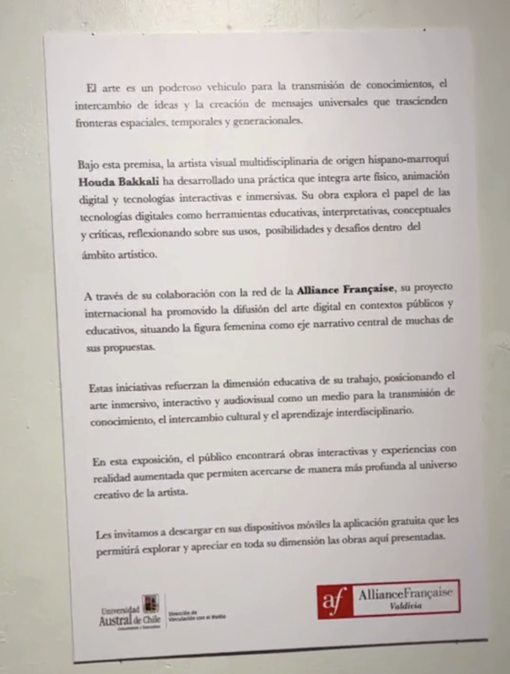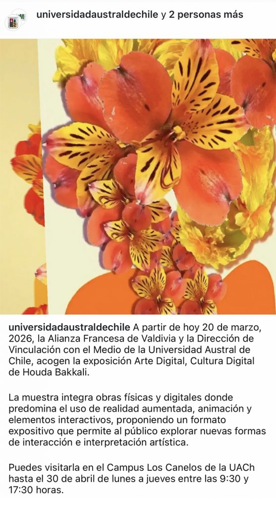 A partir del 20 de marzo, 2026, la Alianza Francesa de Valdivia y Dirección de Vinculación con el Medio de la Universidad Austral de Chile, acogen la exposición Arte Digital, Cultura Digital de Houda Bakkali. La muestra integra obras físicas y digitales donde predomina el uso de realidad aumentada, animación y elementos interactivos, proponiendo un formato expositivo que permite al público explorar nuevas formas de interacción e interpretación artística. La exposición se complementa con una galería virtual, contenidos multimedia y recursos divulgativos y didácticos, orientados a contextualizar el arte digital, sus aplicaciones, usos y principales retos dentro del panorama cultural contemporáneo. El proyecto se desarrolla en el marco del Mes de la Francofonía, un evento internacional que celebra la diversidad de las culturas francófonas.