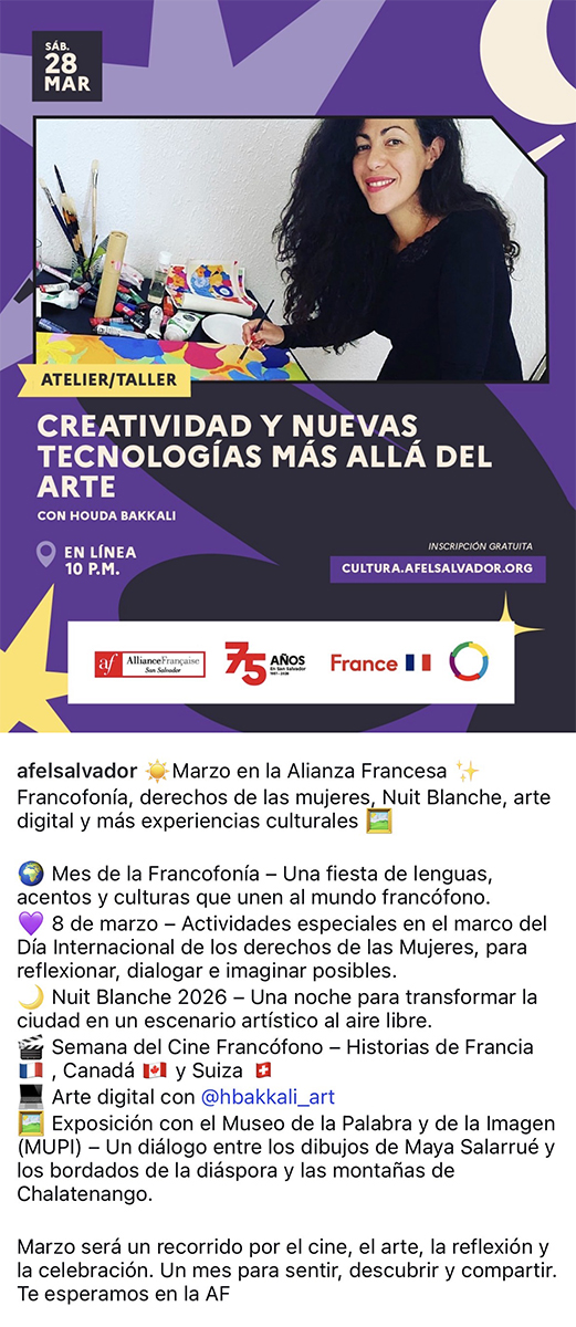 Through the network of the legendary Alliance Française, Houda Bakkali has carried out a wide range of educational and outreach activities, including workshops and masterclasses in countries and cities such as Loja, Quito, Guayaquil, Cuenca and Portoviejo (Ecuador), Mexico City (Mexico), Bogotá (Colombia), Phuket (Thailand), Trujillo (Peru), Piura (Perú) Valdivia (Chile) and Mérida (Mexico), as well as Q&A sessions in Auckland, New Zealand.